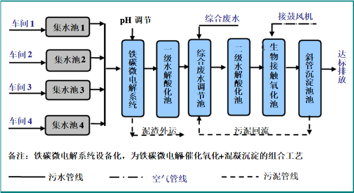 各類生產(chǎn)線的廢水進(jìn)行單獨(dú)收集,之后統(tǒng)一送入初調(diào)節(jié)池中進(jìn)行水質(zhì)的調(diào)節(jié),;預(yù)處理采用“鐵碳微電解+催化氧化+混凝沉淀”工藝,沉淀溢流到一級(jí)水解酸化池中,之后流入到綜合調(diào)節(jié)池中,與生活污水、清潔下水混合后,送入二級(jí)水解酸化池,水解后出水至生物接觸氧化池中進(jìn)行好氧處理,處理后水進(jìn)入沉淀池中,上清液排放。